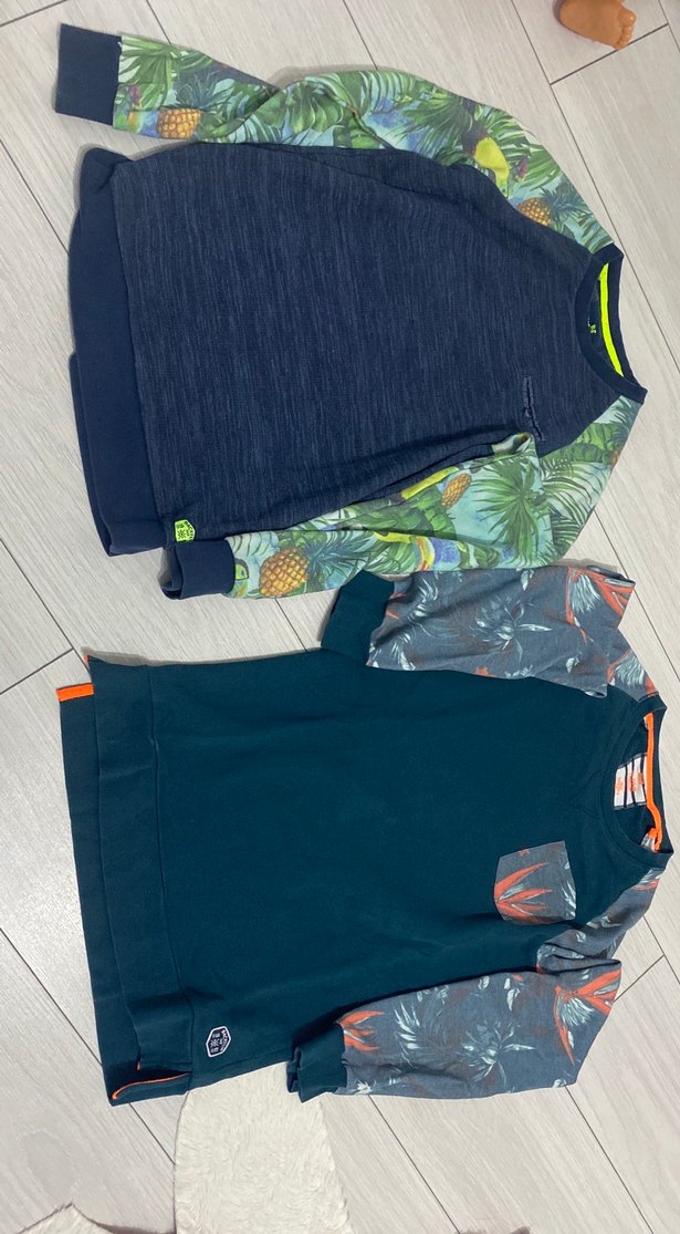 Erkek çocuklar için örme, kısa kollu ve bol kesim bir kazak. Sentetik kumaştan, koyu mavi renkli ve baskılı streetwear tarzında.