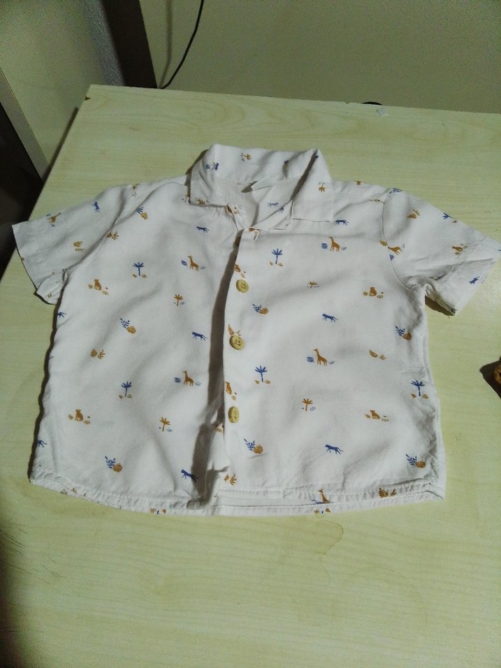 Kısa kollu, düğmeli ve yakalı erkek çocuk gömleği. Pamuklu kumaştan, bol kesim ve pastel beyaz üzerine küçük baskılar içerir. Rahat sokak stili için uygundur.