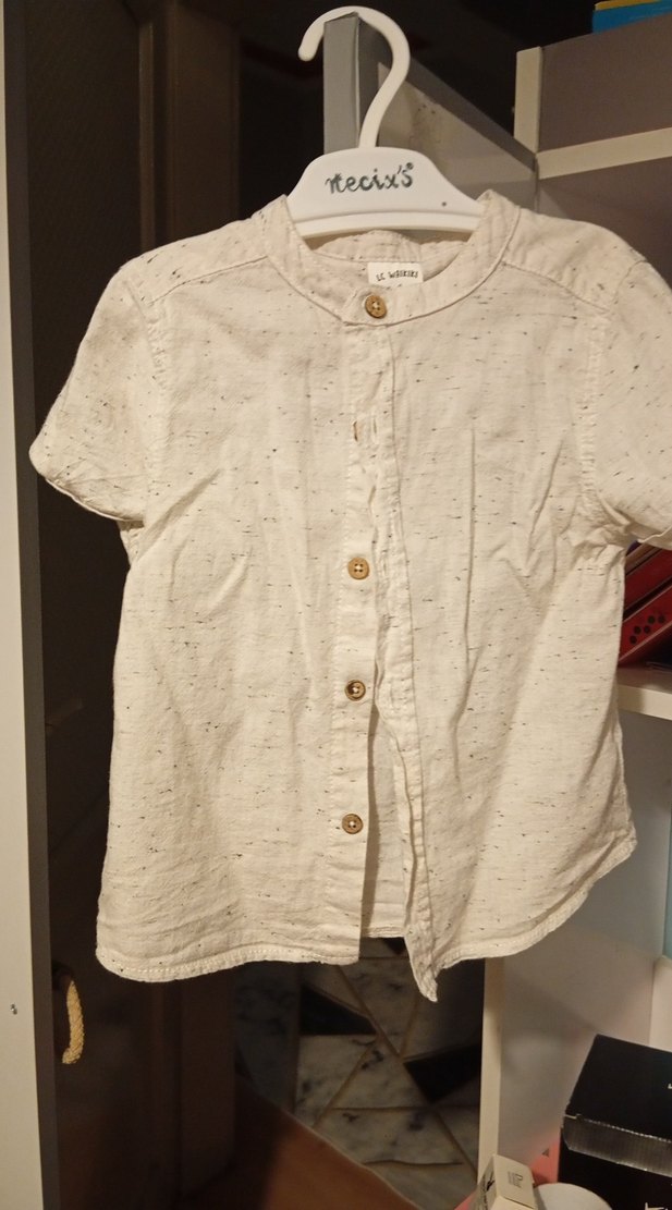 Beyaz renkli, kısa kollu, yakalı ve düğmeli erkek çocuk gömleği. Pamuklu, bol kesim ve hafif bohem tarzda. Marka: gömlek sıfırdır hiç kullanılmadi hediye gelmişti küçük yaş alinmis