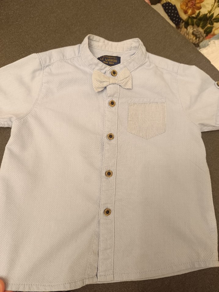 Kısa kollu, pamuklu erkek çocuk gömleği, düğmeli ve yakasında küçük cep ile birlikte şık bir papyon içerir. Rahat kesim ve açık mavi renklidir.