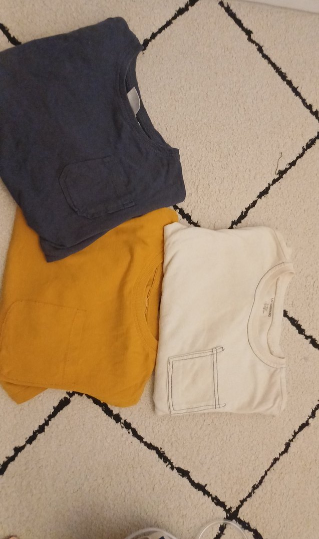 Yumuşak pamuktan, kısa kollu, küçük cepli, koyu deve tüyü renkli, bol kesim erkek çocuk kazağı.