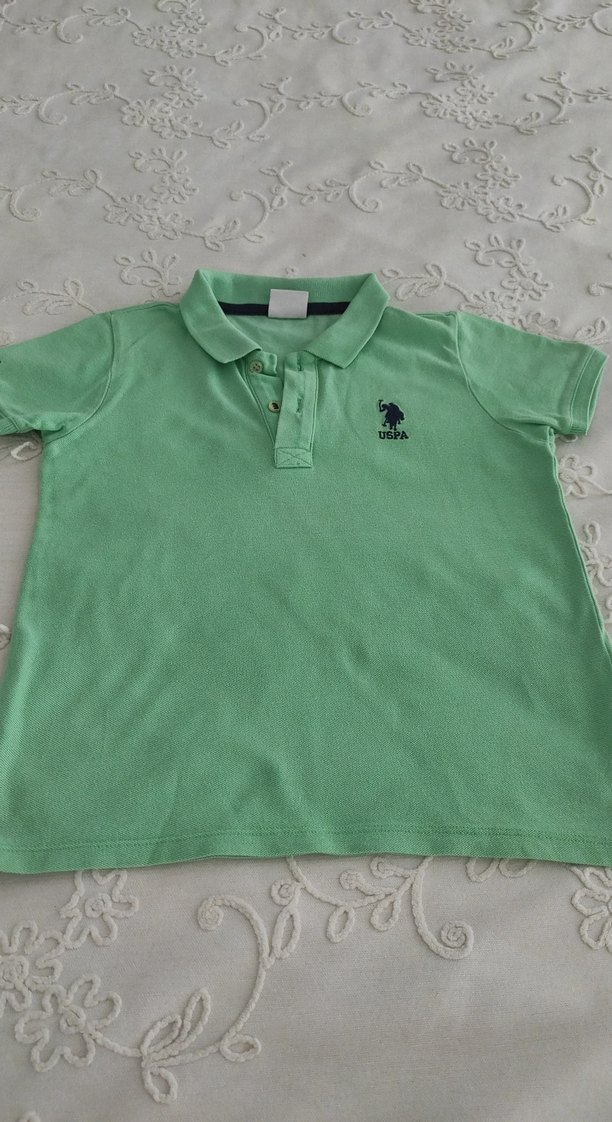 yeşil renkli, kısa kollu, yakalı ve düğmeli, baskılı detaylı erkek çocuk polo tişörtü. #polo#hm#zara#uspa