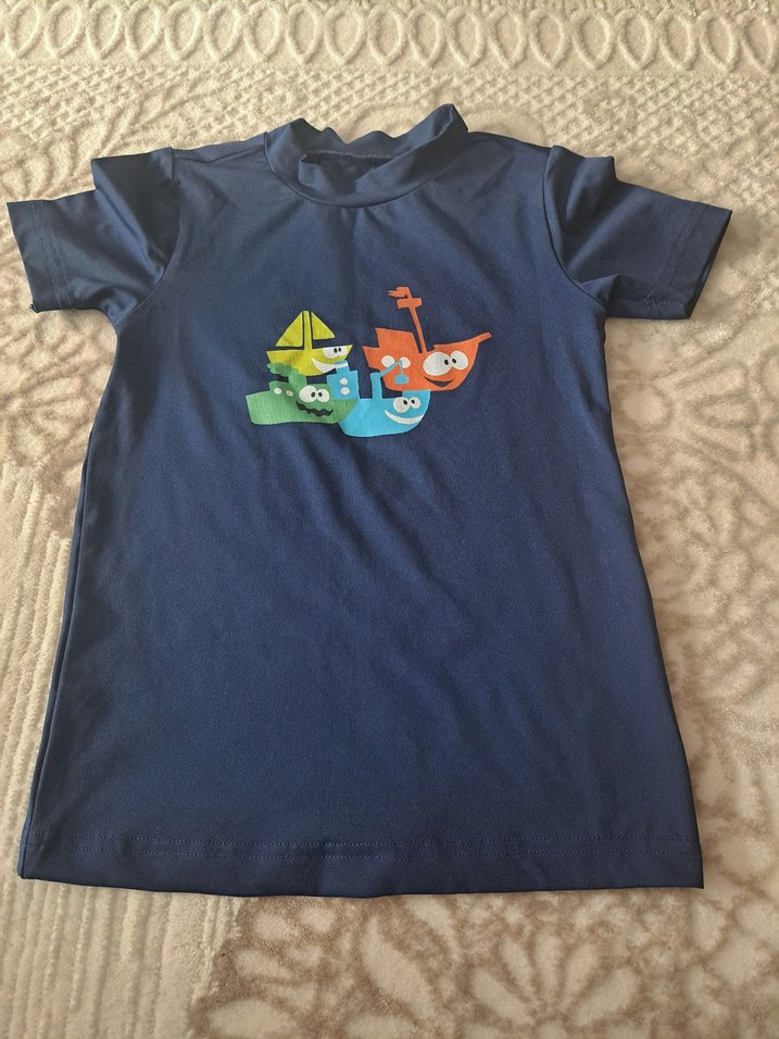 Erkek çocuklar için kısa kollu, önünde renkli gemi baskıları olan mavi mayo üstü. Konforlu su aktiviteleri için uygun. 3 yaşa uygun etiketi yok