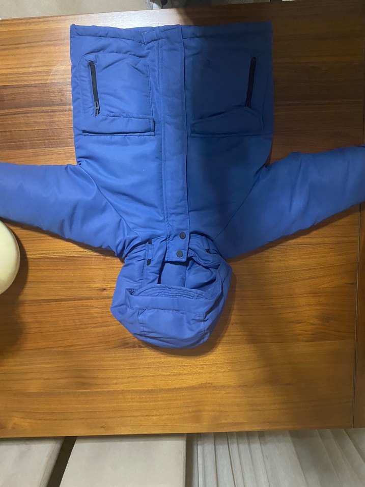 yumuşak ve sıcak kumaştan yapılmış, mavi erkek çocuk montu. Cepli ve kapüşonlu şişme mont. 3-4 yaş.