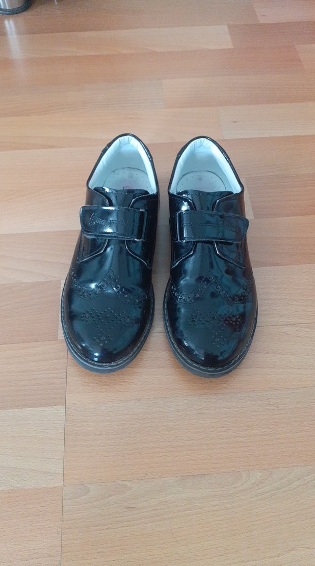 Siyah rugan görünümlü, tokalı erkek çocuk özel gün ayakkabısı, klasik gotik tarzda ve parlak yüzeye sahip.