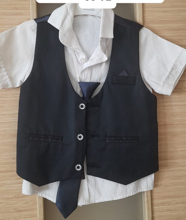 Erkek çocuk için düğmeli koyu renk yelek, beyaz kısa kollu gömlek ve uyumlu kravat içeren modern klasik tarzda takım.