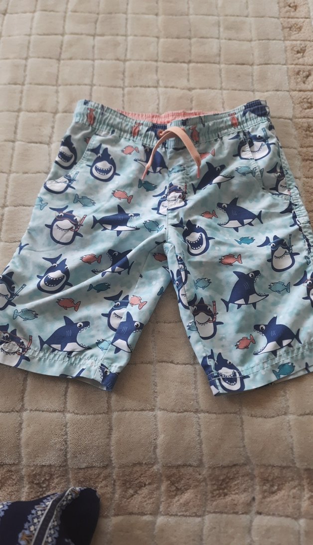 Erkek çocuklar için renkli köpekbalığı desenli, lastikli bel ve bağcıklı rahat şort. Yumuşak kumaş, sıcak havalar için uygun. Deniz şortu
