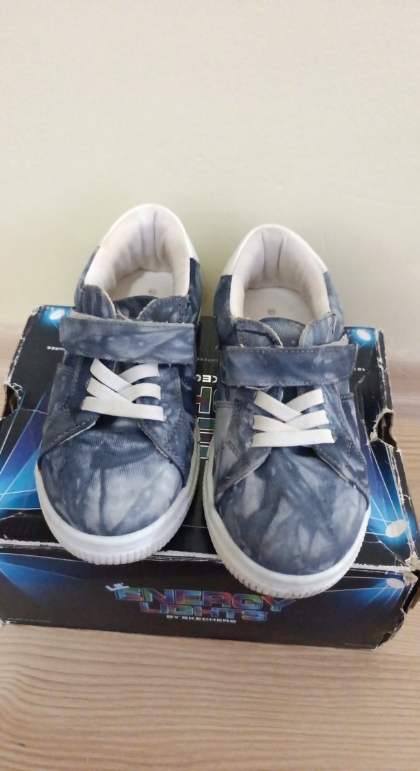 Erkek çocuklar için mavi kot kumaştan, gri batik desenli spor ayakkabılar. Cırtlı bant ve beyaz bağcıklarla kolay kullanım sağlar. Sokak stiline uygun.