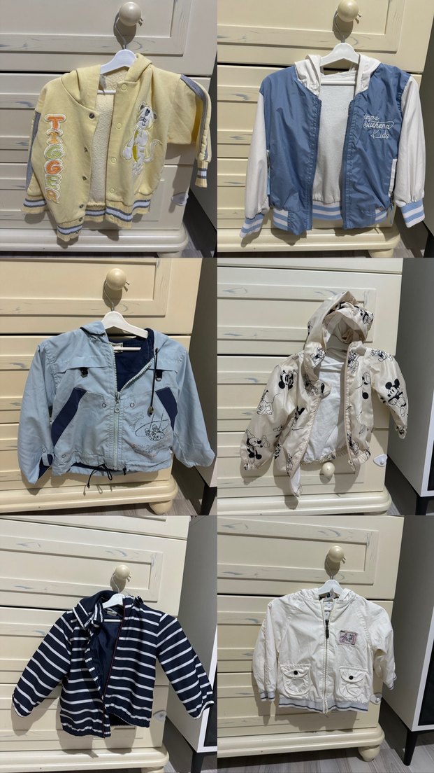Erkek çocuklar için bol kesim, kapüşonlu ve baskılı desenli çeşitli stil kot ceketler, rahat ve şık görünüme uygun. Az kullanılmış temiz