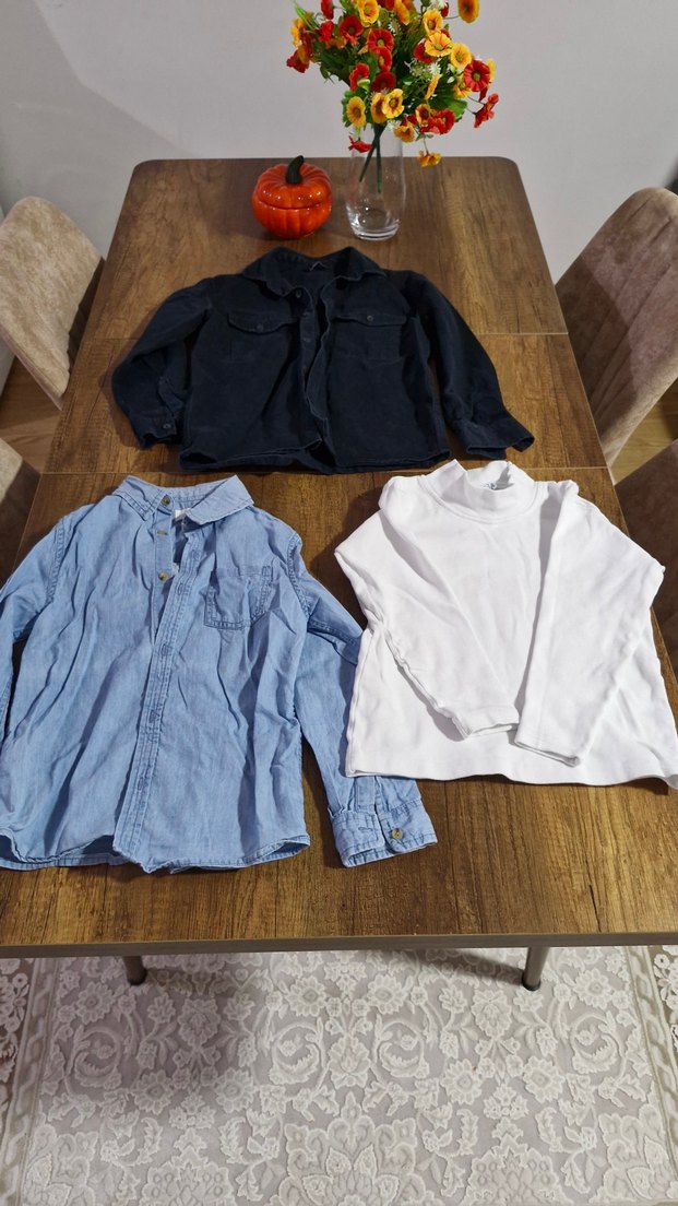 Erkek çocuk için 2 tane gömlek 1 tane uzun kolu boğazlı body tişört Sıyah olan kalın kot kumaşlı Mavi olan ince pamuk kumaşlı marka temsili ürünler tertemiz hic bir sorunu yok. Toplu satıyorum