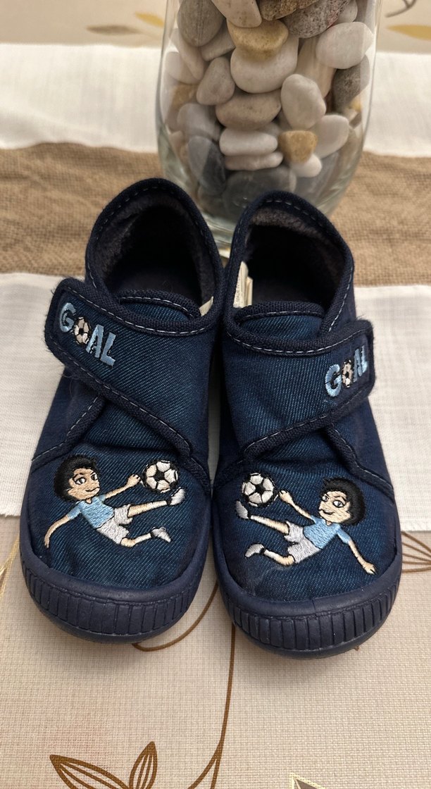 Koyu mavi kot kumaştan yapılmış, nakışlı futbol desenli ve cırt cırtlı erkek çocuk terliği, sokak tarzına uygun. ⚽