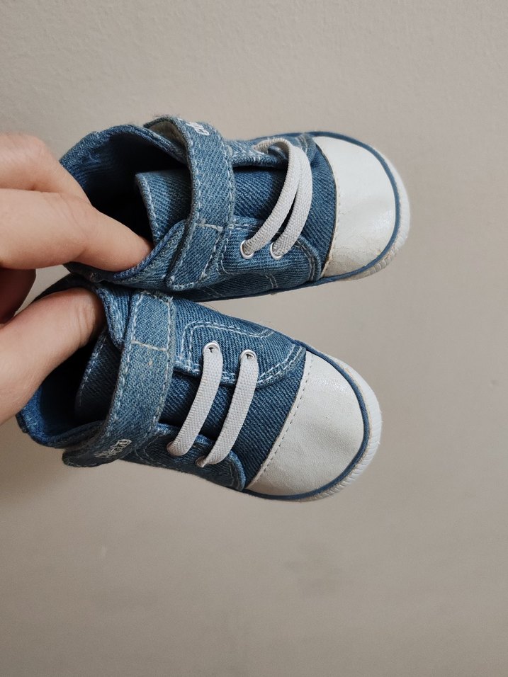Mavi kot kumaşlı, cırt cırtlı ve beyaz burunlu erkek çocuk spor ayakkabısı. Trendy ve rahat sokak stili için uygun. 19 numara.