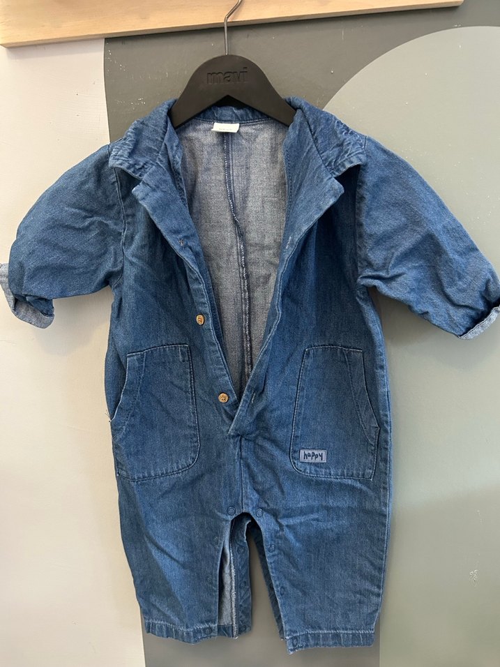 Mavi tonlarında, düğmeli, kısa kollu, bol kesim erkek çocuk kot tulumu. Ön cepleri ve sokak modası tarzı bulunur.