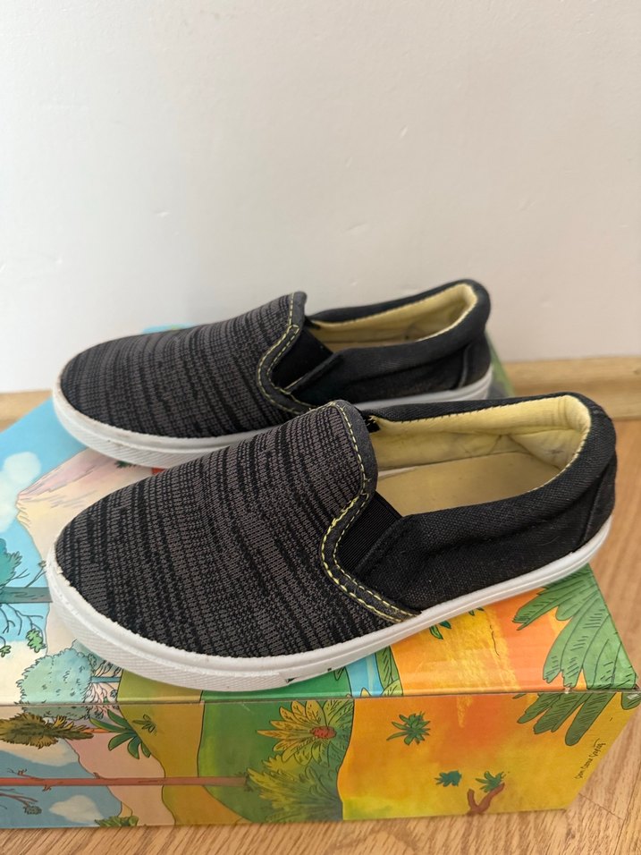 Erkek çocuk için koyu gri ve sarı tonlarında bağcıksız spor ayakkabılar. Kauçuk taban, rahatlık ve dayanıklılık sunar.