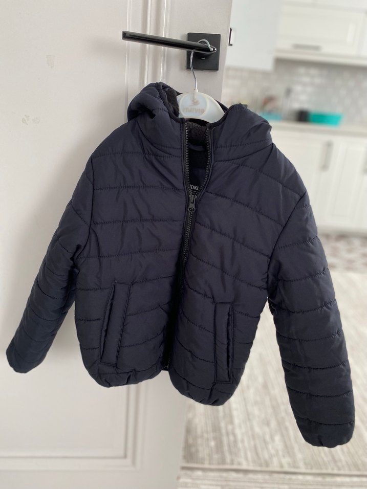 Erkek çocuk için kapüşonlu, fermuarlı ve notched lapel yakalı koyu gri mont. Yumuşak ve sıcak kumaştan, sokak stiline uygun.
