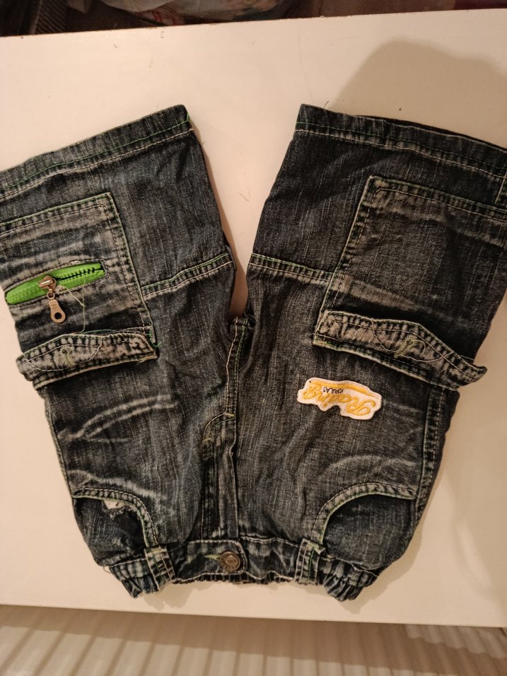 Koyu kahverengi kot pantolon, bol kesim ve tokalı detaylarla. Nakışlı desenler sokak tarzı havası katıyor. Rahat ve trend görünümlü.