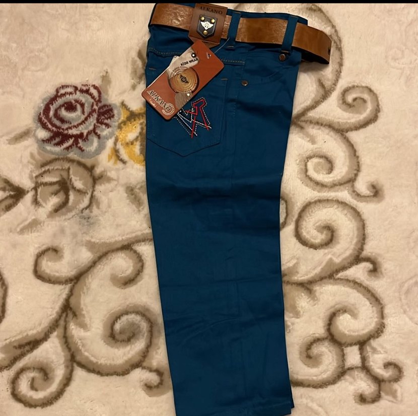 Erkek çocuklar için koyu mavi baskılı kot pantolon, kahverengi kemerle birlikte gelir. Rahat oturan kesimiyle günlük sokak giyimine uygundur.