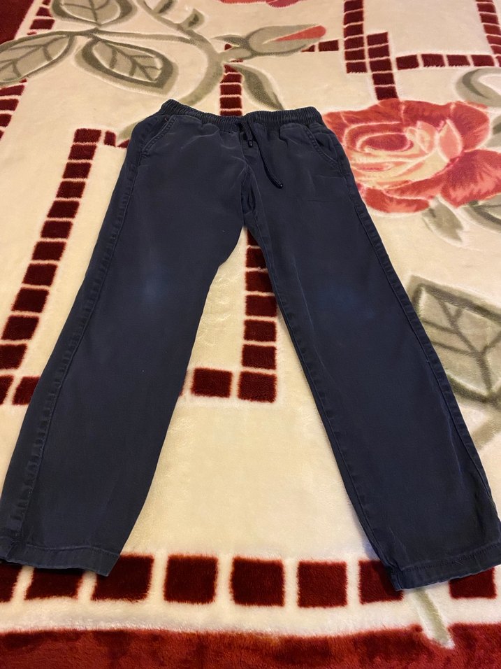 Koyu mavi kot kumaştan, bol kesim beli lastikli bağcıklı , rahat sokak stili erkek çocuk pantolonu. 11-12 yaş ama 10 yaş da giyebilir