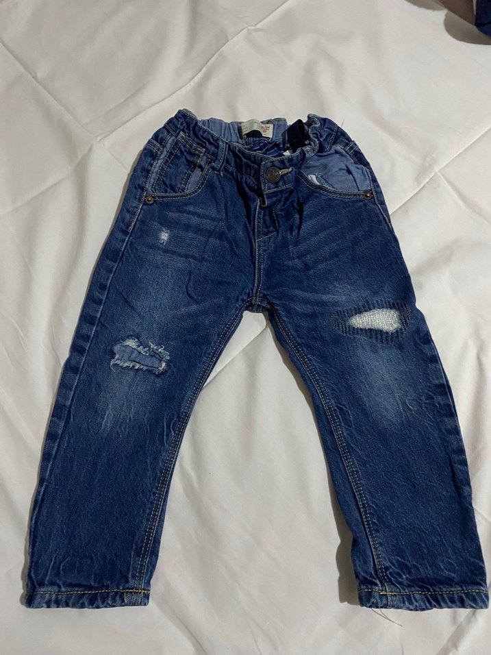 Erkek çocuklar için koyu mavi kot pantolon, bol kesim ve tokalı detaylara sahip. Sokak modasına uygun, hafif yıpranmış görünümlü rahat bir model.