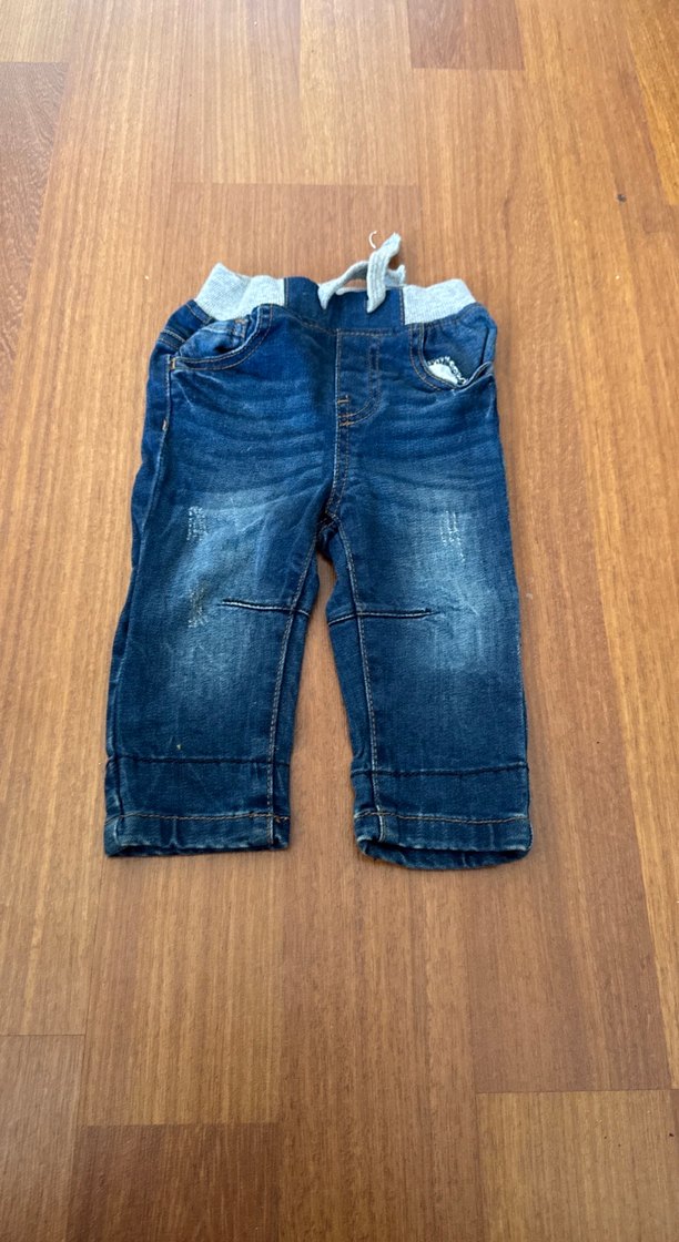 Erkek çocuklar için bağcıklı beli ve bol kesimiyle koyu mavi kot pantolon. Rahat ve gündelik kullanıma uygun.