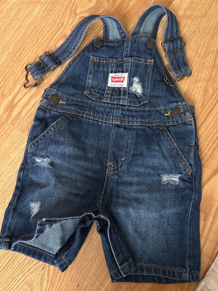 Ayarlanabilir tokalı askıları ve hafif yırtık detaylarıyla koyu mavi, fitted erkek çocuk denim salopet. Çok az kullanıldı