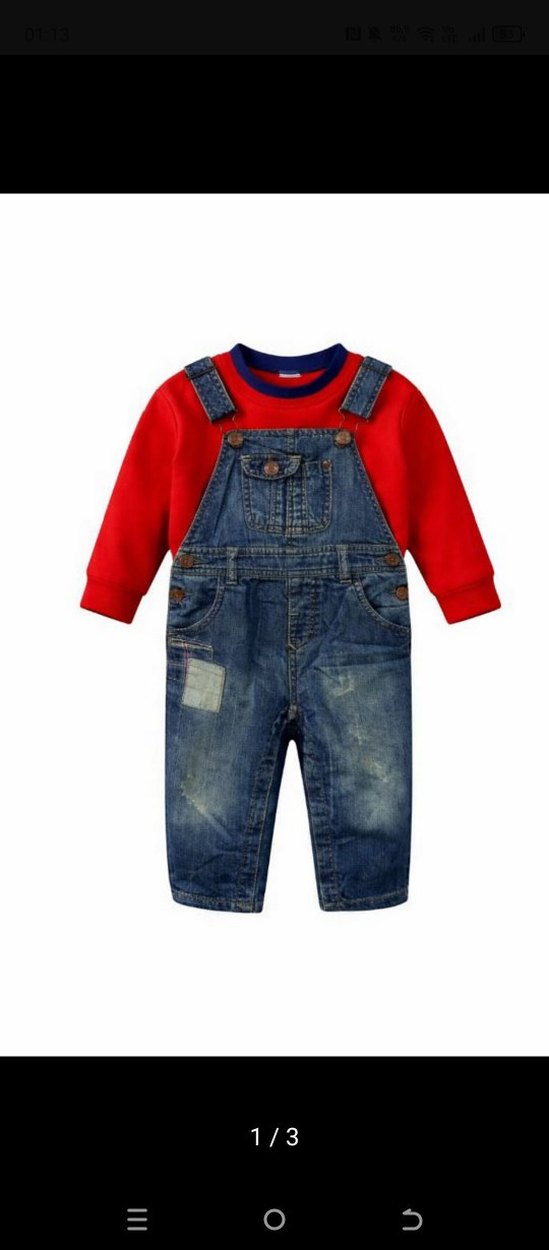 12-18 ay Rahat kesim, tokalı koyu mavi denim erkek çocuk tulumu. Canlı kırmızı renk uzun kollu gömlek ile kombinlenmiştir. Sokak stiline uygun cepli ve yama detaylı.