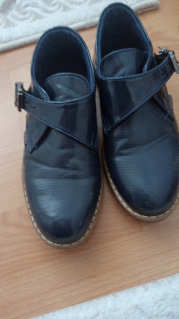 Koyu mavi deri erkek çocuk ayakkabısı, tokalı tasarıma sahip. Sade ve rahat normcore stilinde, özel günler için uygun. iki defa giyildi düğünde