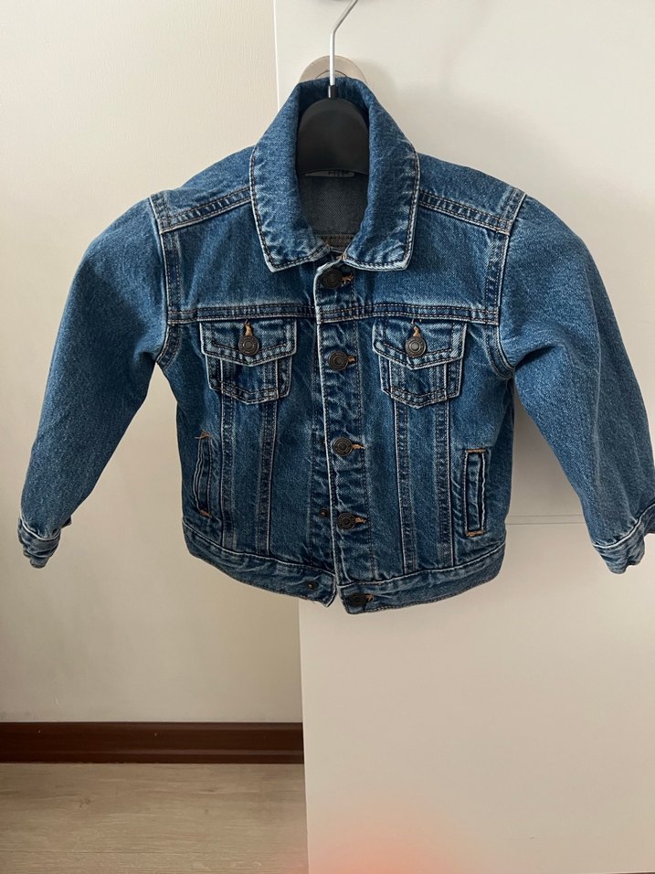 Sadece iki kez giydi. Düğmeli, fitted kesim erkek çocuk koyu mavi denim ceket. Notch yaka ve iki göğüs cebine sahiptir. Trendy casual stil için uygun.