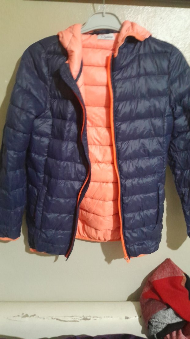 Erkek çocuk için koyu mavi, ince şişme mont. Fermuarlı, yakası kesimli ve sentetik kumaştan üretilmiş, desen içermeyen rahat bir dış giyimdir.