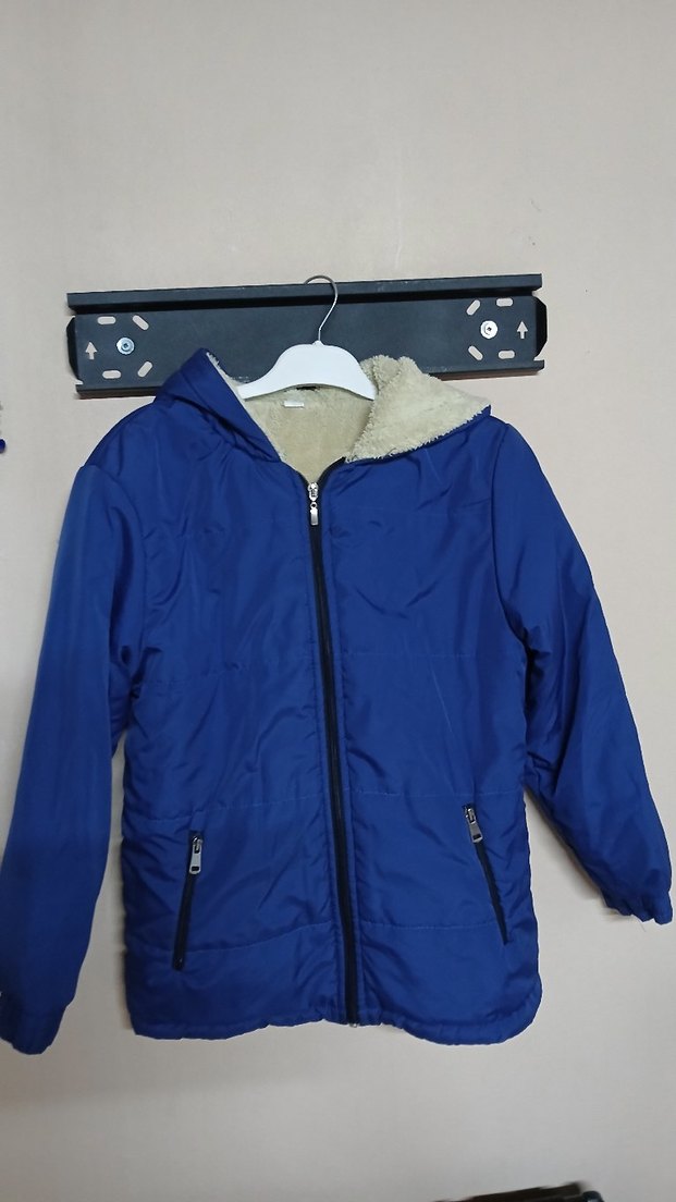 Erkek çocuklar için kapüşonlu, fermuarlı cepli, yumuşak ve sıcak kumaştan yapılmış koyu mavi, basic ve sade sokak stili mont.
