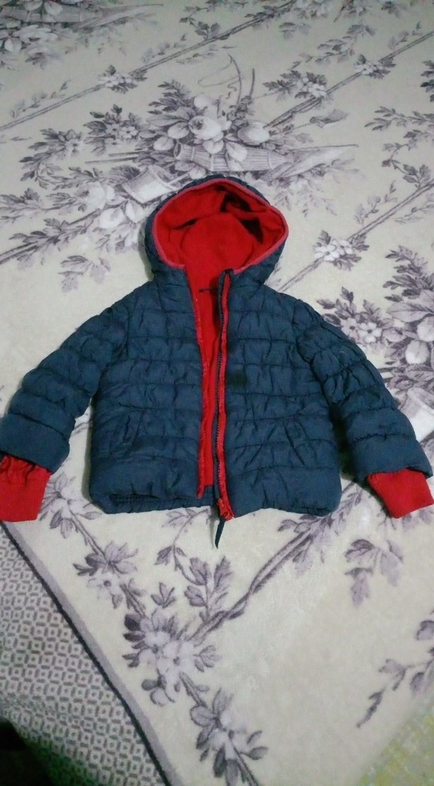 Koyu mavi renkli, kapüşonlu ve fermuarlı, yumuşak ve sıcak dokulu erkek çocuk montu. Kırmızı iç astar ve manşetlerle rahat sokak stili için uygun.