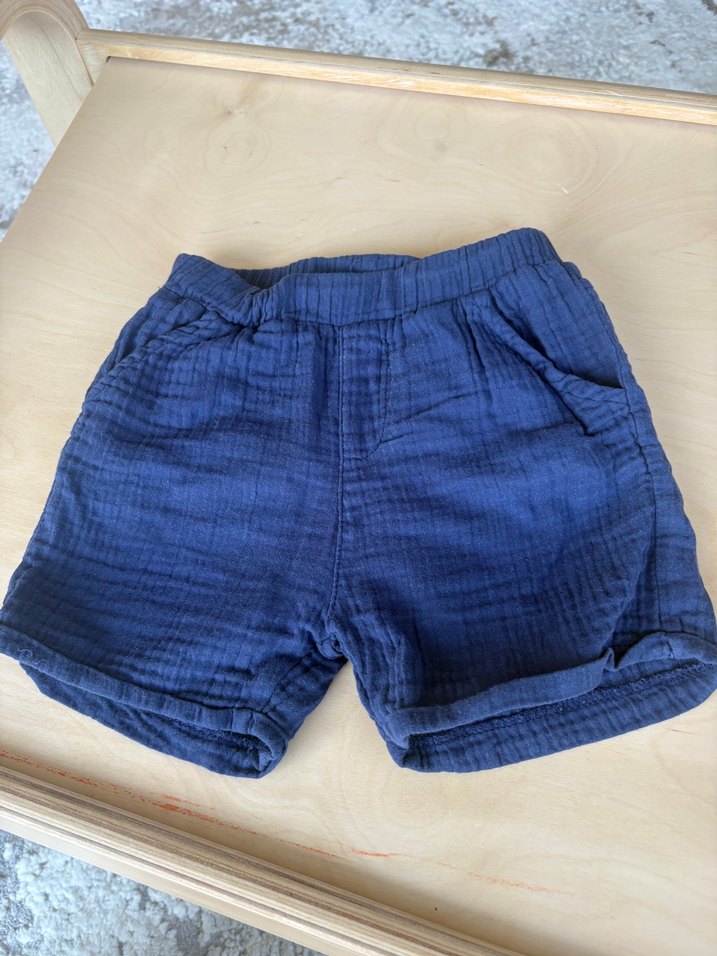 Koyu mavi keten kumaştan, düğmeli detaylı, bol kesim erkek çocuk şortu, sade ve rahat bohem tarzda.