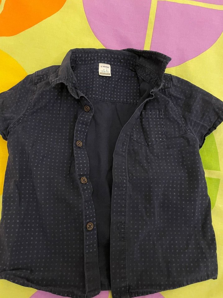 Koyu mavi renkte, kısa kollu, düğmeli, yakalı ve bol kesim erkek çocuk denim gömlek. İnce noktalı deseniyle trend sokak stiline uygundur.