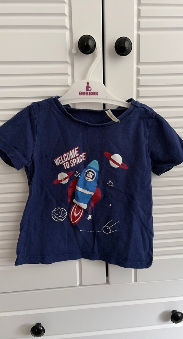 Koyu mavi renkli, baskılı uzay temalı desenli, kısa kollu ve bisiklet yaka erkek çocuk tişörtü.
