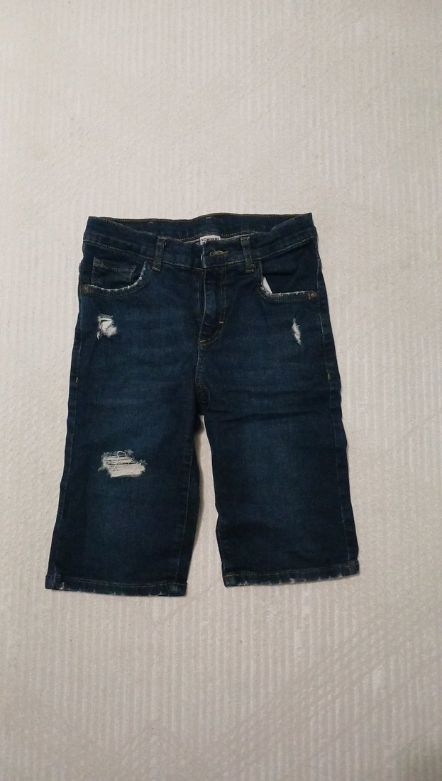 Koyu mavi kot şort, rahat kesim ve kemerli beliyle sokak stiline uygun, hafif yıpratılmış görünüme sahip.