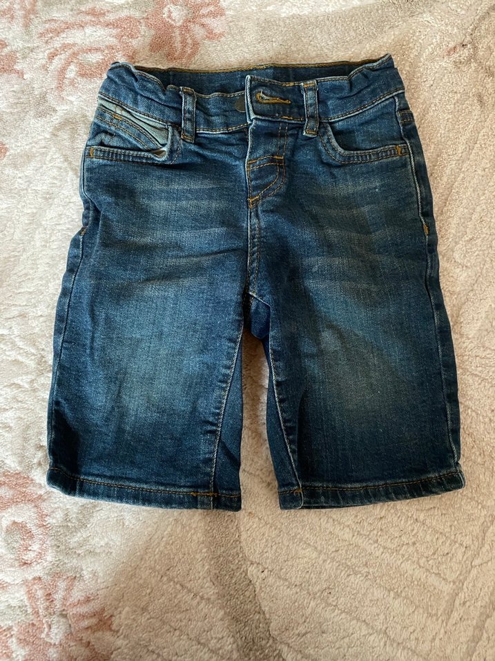 Erkek çocuklar için bol kesim, koyu mavi kot şort, kemerli ve desensiz sade tasarıma sahip.