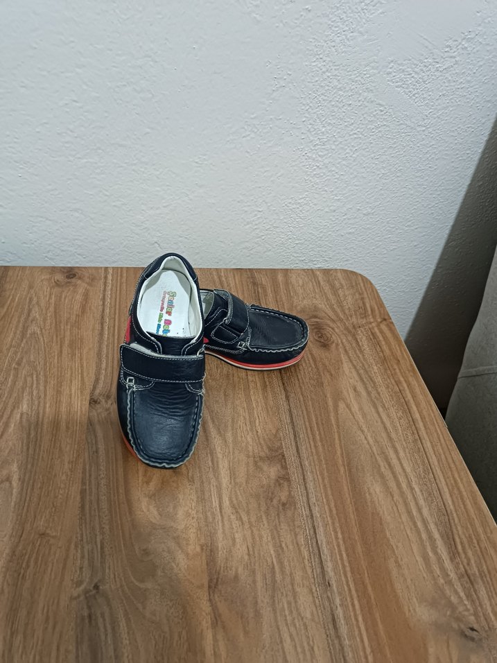 Koyu mavi, tokalı, dayanıklı deri malzemeden yapılmış erkek çocuk özel ayakkabısı, modern ve rahat tarzda. Bir iki defa anca giyildi sıfır ayarında.