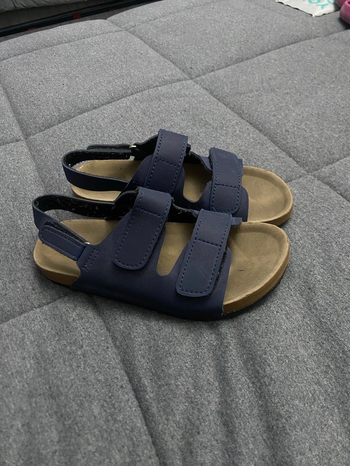 Koyu mavi renkte, tokalı bantlara ve kauçuk tabana sahip erkek çocuk terliği. Rahat ve ayarlanabilir, günlük sokak tarzı için uygun.