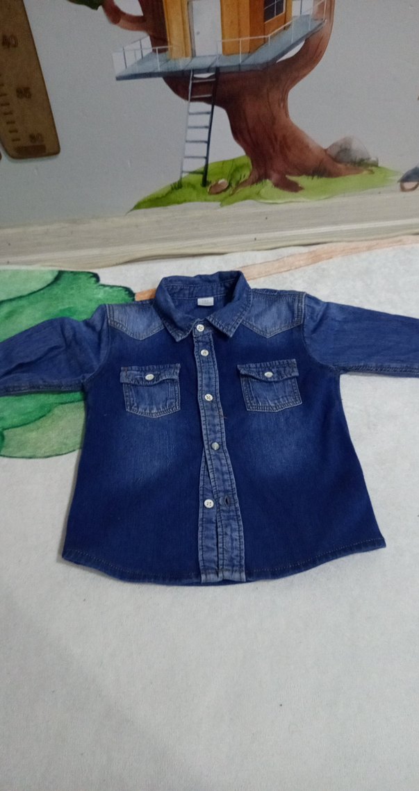 Erkek çocuk için koyu mavi renk, uzun kollu, düğmeli, yakalı, bol kesim denim gömlek. Sokak stiline uygun rahat bir model.