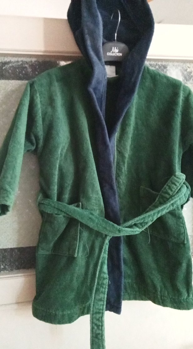 Erkek çocuklar için koyu yeşil kapüşonlu, kemerli ve iki cepli yumuşak, emici kumaştan bornoz.