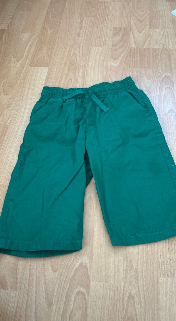 Erkek çocuklar için koyu yeşil keten şort, bol kesim ve bağcıklı lastikli bel ile sokak stili için uygundur.