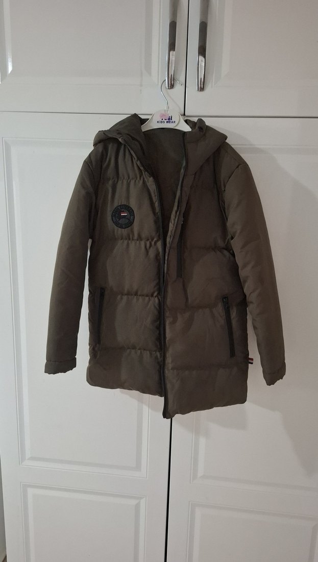 Düğmeli ön ve kapüşonlu, yeşil erkek çocuklara uygun, rahat kesim kaban. Yumuşak ve sıcak dokusu ile sokak stiline uygun.sadece fermuar kısmı bozuk