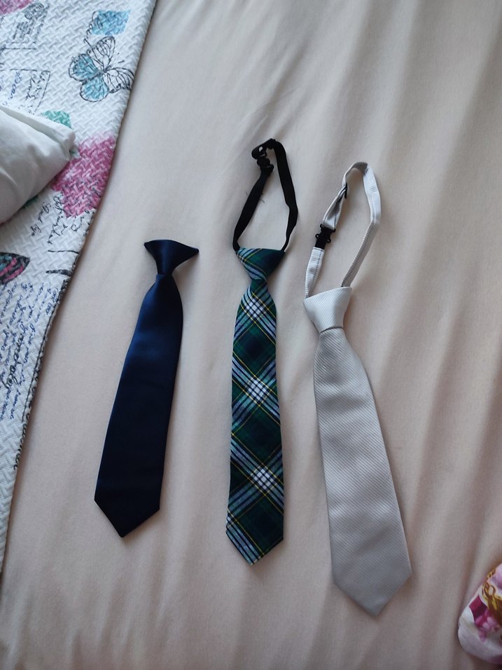 Üçlü erkek kravat seti; düz ve ekose desenli, ayarlanabilir boyun askılı.Yaş aralığı tam bilmiyorum. ama 4/5 yaşa kadar kullanıldı. sadece beyaz olanın dikişlerinde açılma var. arka tarafta kaldığı için gözükmüyor. uygun fiyat.