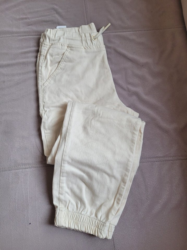 Krem renkli erkek çocuk pantolonu, rahat kesimli ve rahat elastik bel ile manşetlere sahip, zahmetsiz şıklık sunar.
