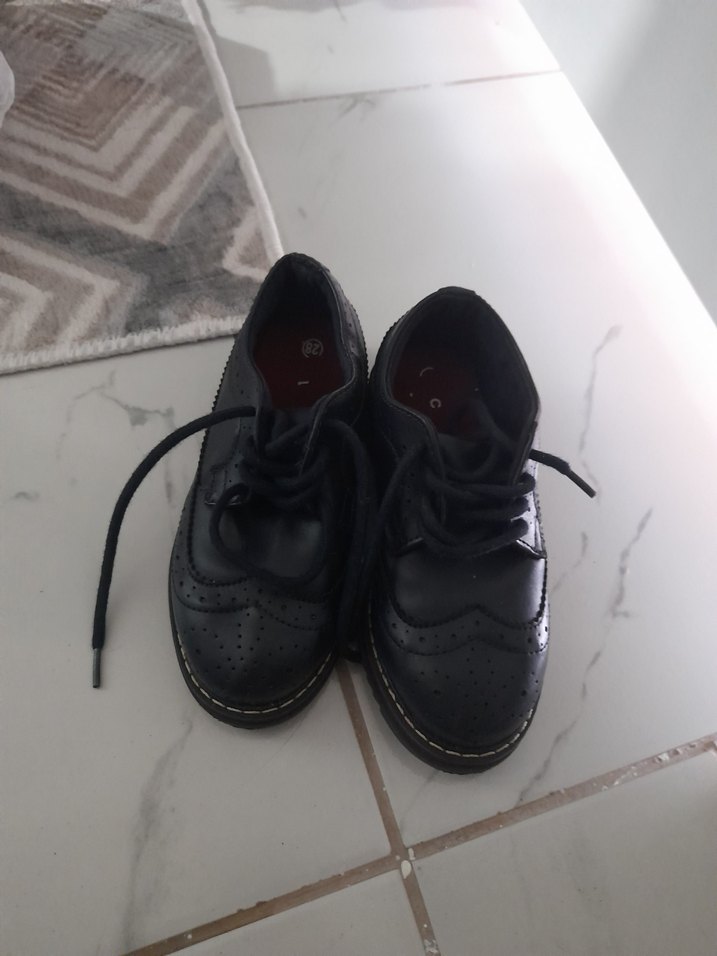 erkek çocuk özel gün ayakkabısı. Desensiz ve koyu renklidir.