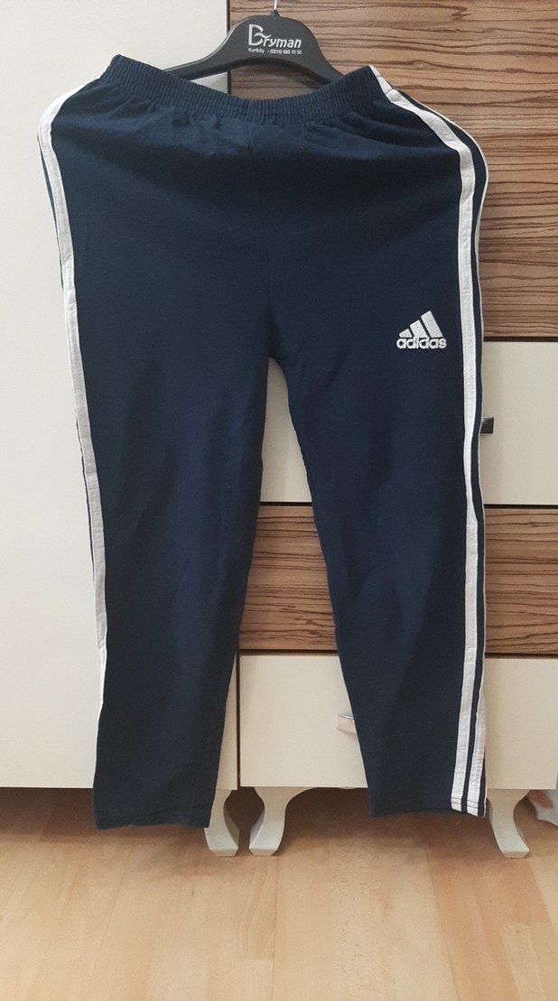Lacivert Adidas eşofman altı, elastik bel ve beyaz yan çizgilerle, penye kumaştan üretilmiştir. orta kalınlıkta ufak tadilatları vardır ama evde ve günlük kullanıma uygundur beden etiketi olmadığı için ölçüleri resimlerde mevcuttur