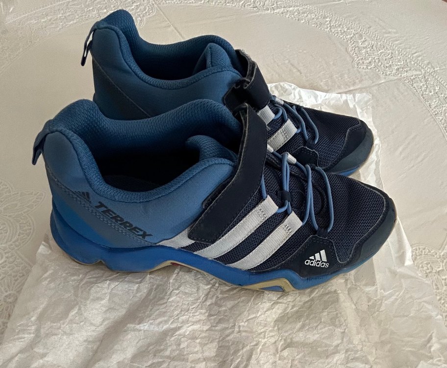 Lacivert renkli, original Adidas Terrex, cırt cırtlı kapanışa sahip erkek çocuk spor ayakkabısı. Kauçuk tabanlı, günlük outdoor stili için uygun. 38,5 beden.