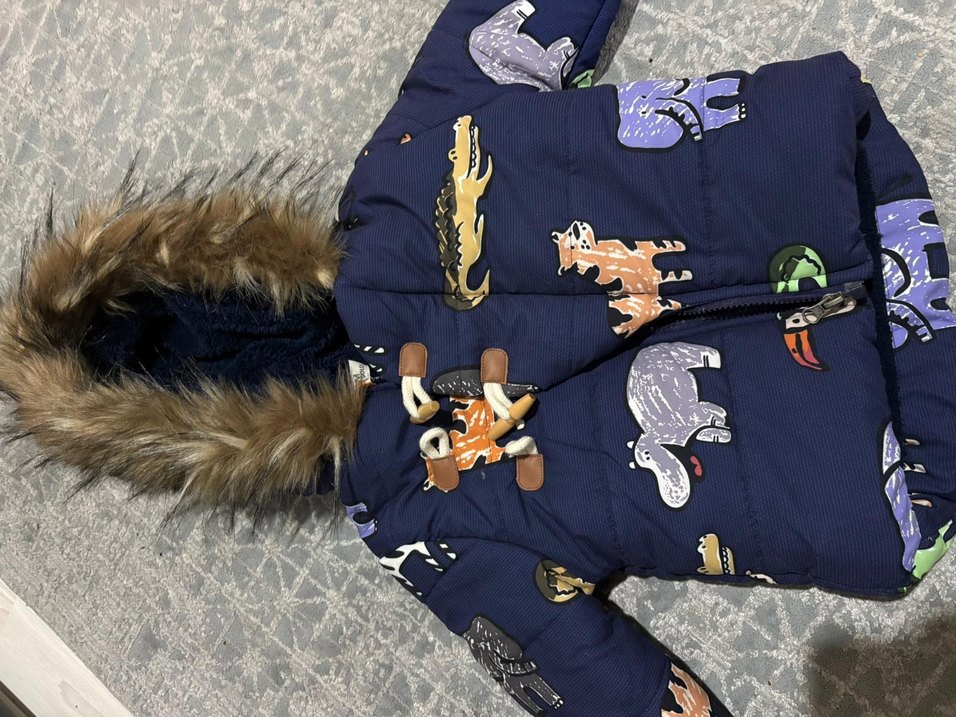 Erkek çocuk için lacivert baskılı, kürklü kapüşonlu ve yumuşak kumaştan yapılmış, dar kesim, notched lapel tarzında sokak modasına uygun mont 1 yaş