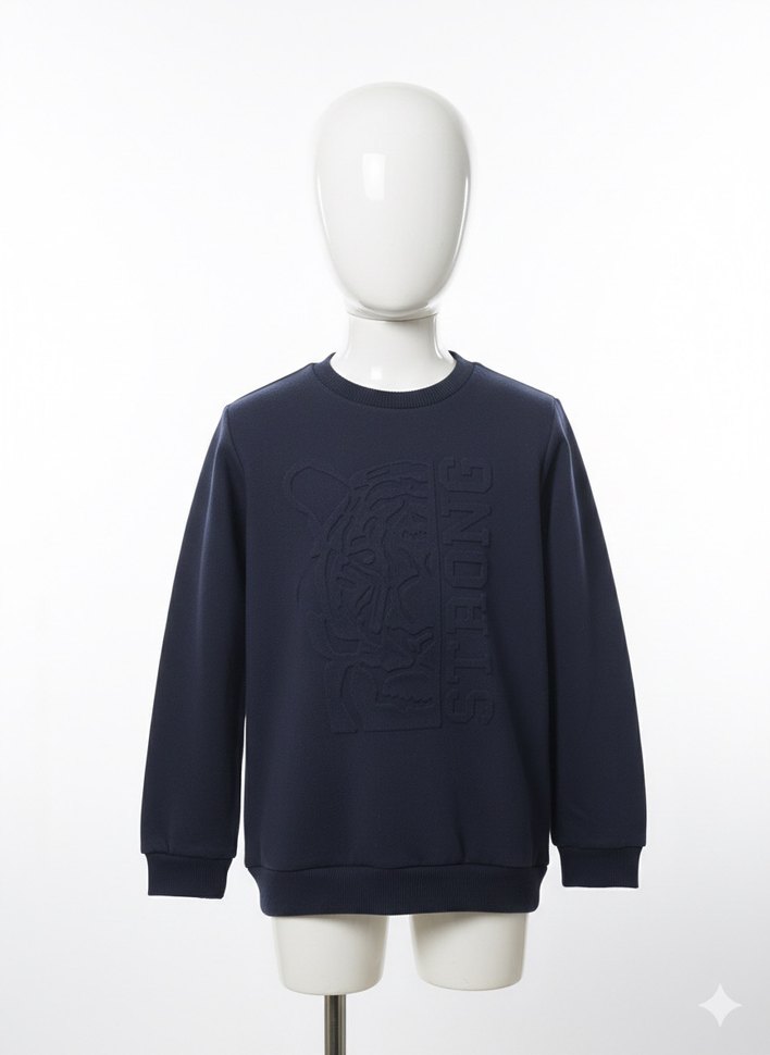 Lacivert renkte, bisiklet yaka ve uzun kollu erkek çocuk sweatshirtü. Yumuşak ve sıcak fleece kumaştan, bol kesim, örme dokulu ve baskılı detaylıdır.