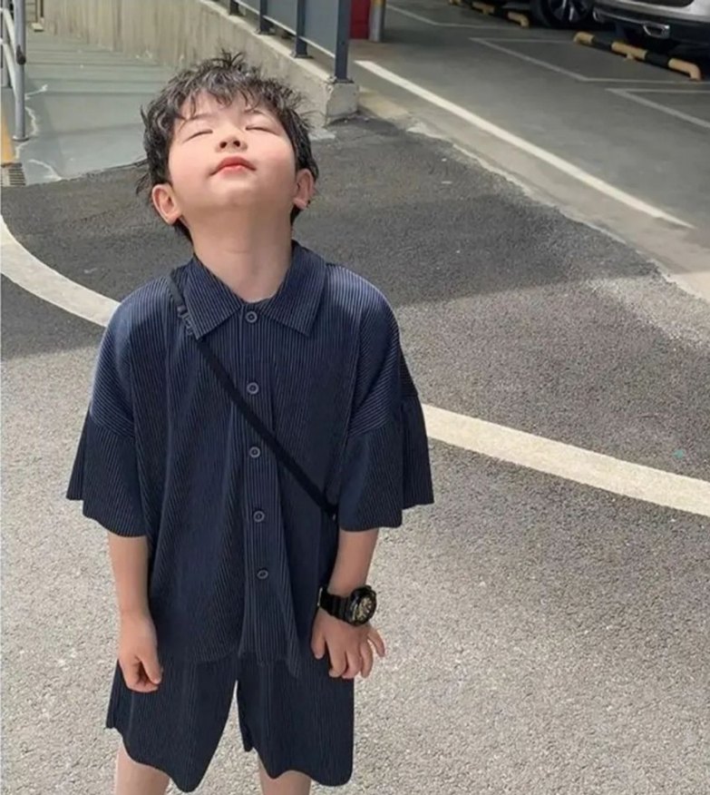 Erkek çocuklar için bol kesim, kısa kollu ve yakalı lacivert denim gömlek. Düğmeli ve desensiz, trend sokak stili için uygun. Kore modeli.